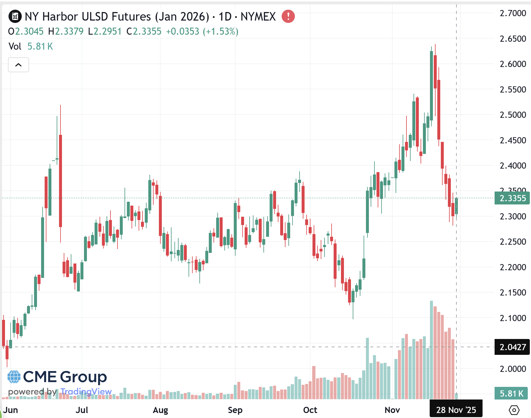 It is very rare to see the markets drop going in to a long weekend. Wednesdays dip capped off a six day free fall for diesel pricing that saw roughly $.25 get erased, leaving about $.15 left to go to get back to mid OCT levels. While today is electronic trading only with no close, a further slide appears to be stalled as a “glitch” has halted trading for the early morning. The slide comes primarily on the squeeze of front month position holders having to roll their contracts into a backward market on a short month. News of a Russian-Ukraine peace deal helped the downward spiral earlier, with the theory that Russian product will only add to the over supplied market, has now subsided for it will be difficult to get Ukraine to accept a land swap and for Russia to commit to no more aggression. Still, we have much to be thankful for, most notably You. All of us at DKB Thank You for your business and partnership over the past year. With the holidays upon us, so is winter fuel, which you will start to see Monday night. We specialize in operability and spending 10 minutes with your Rep to discuss your specific needs is always time well spent.