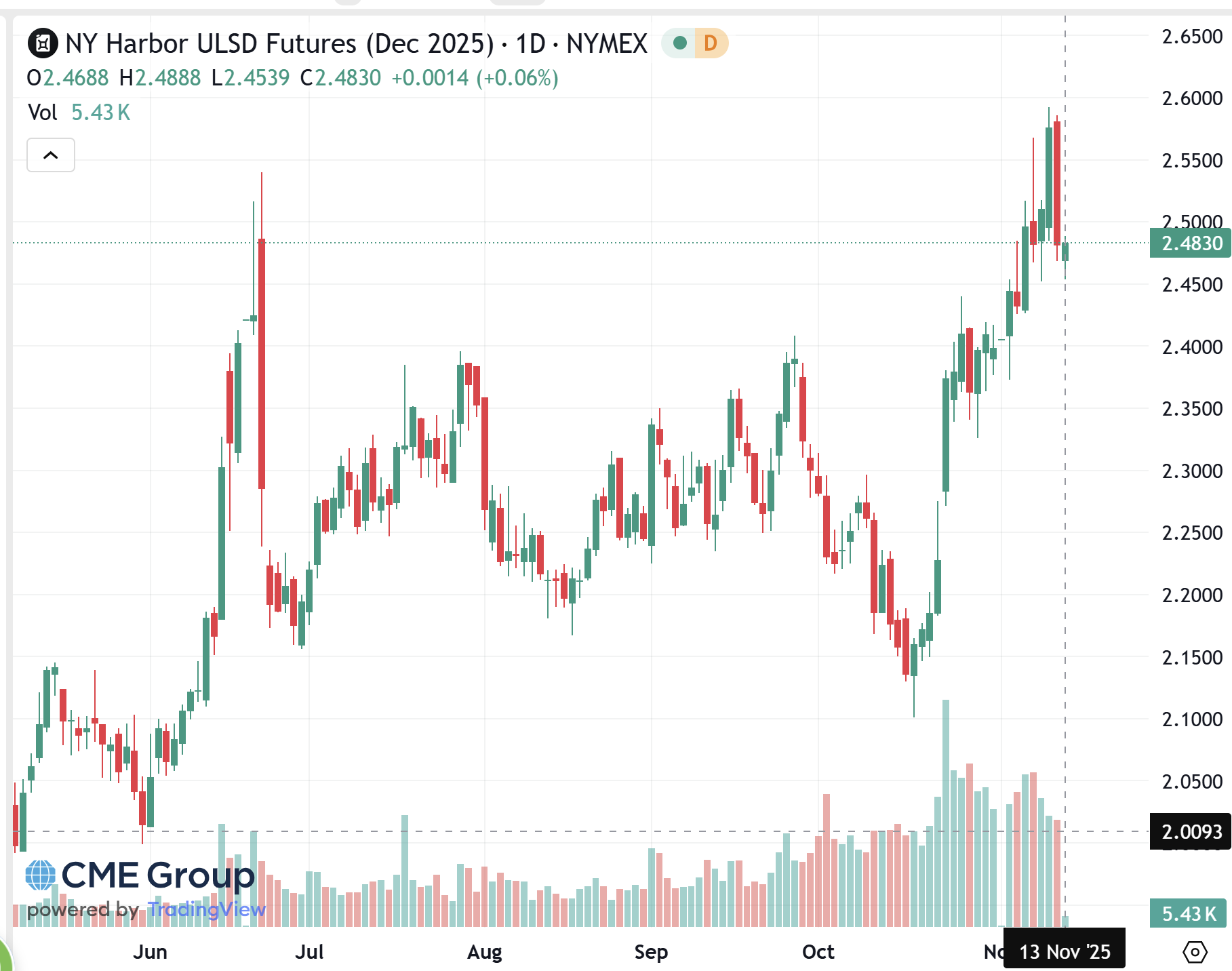 Yesterday finally gave some relief from the meteoric rise both gasoline and diesel pricing the last month. Most of which has been attributed as collateral damage to increased Russian oil sanctions, designed to affect those countries still purchasing such as China and India. In short, with those large buyers switching to US approved sources, it raises the price as demand increases. Unfortunately, Russian products being sold actually kept pricing in check. News that the US and India have a trade deal in place might continue to keep pricing higher. Yesterday’s steep drop centered around news of Houthis formally acknowledging the pausing of any shipping attacks in the Red Sea. This immediately reducing rates, time, and additional costs avoiding the area. Now that the shutdown is over, many have said we could see demand and pricing pick up as federal activity, funding, and curtailed travel gets back to normal. But if that was true, wouldn’t we have seen pricing dip while the shutdown was in place? As we head into a slower overall demand time, its hard to envision pricing staying where it presently resides.