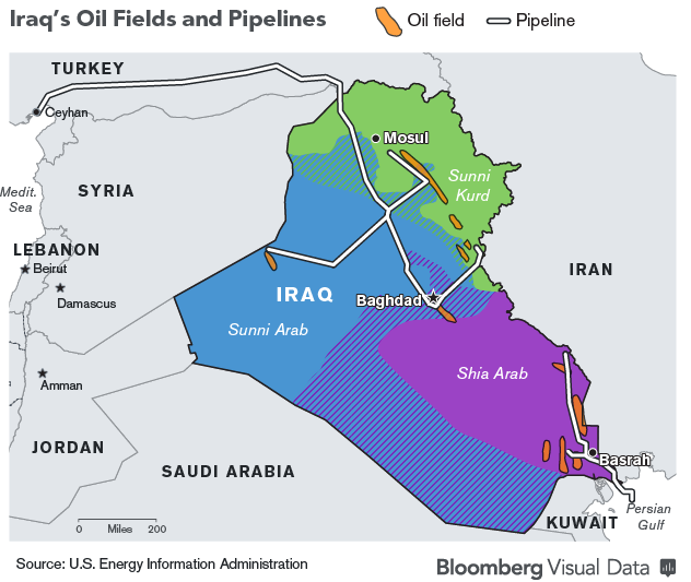 Essentially all of Iraq's oil production comes from the southern, Shia portion of the country by Basra, (see map from Bloomberg above) where militant influence is essentially non existant (at least in comparison) - so some speculate that even should the Baiji refinery or additional cities fall, actual supply is unlikely to be affected as the area is well guarded and safe. However, it pays to keep in mind that no one saw Mozul or Tikrit being as vulnerable as they apparently were - the invasion of Mozul saw over 500,000 people flee the city in 12 hours, including basically the entire coalition of American-trained Iraqi security forces because of the level of violence and choas that erupted. It's less likely that would happen further south, given the relatively small insurgent force and the steeper odds they would face in terms of fighting back - but its certainly not an entirely unreasonable fear.