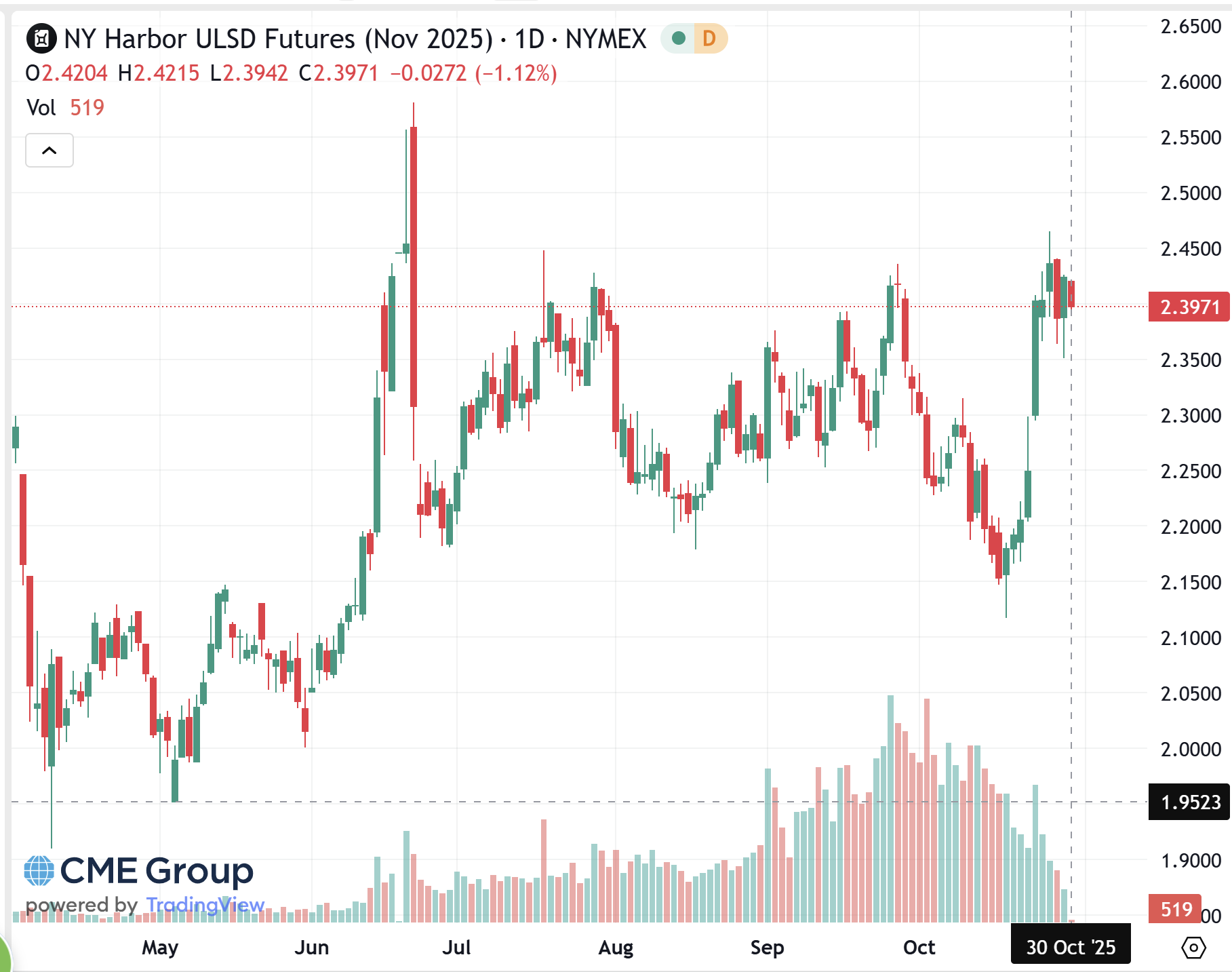 This time last week futures markets were screaming higher on diminishing trade talks with China and larger sanctions on Russia Crude producers and their buyers. Those sanctions, primarily focused on India, appear to be getting some attention as India’s largest refiner is soliciting outside bids for 24mbls of crude for Q1 2026. While that may keep the price higher, on the flipside, we are now “on the same page” with China after yesterdays meeting between the two leaders. As both sides walk back from stronger stances on tariffs, rare earth minerals (this is an important term for years to come), and Ukraine, one would think markets would cool off dramatically. The $.25 gain in diesel pricing in the last week put us right back to the top of the range. Up like a rocket, down like a feather. Largely overlooked was the FED cutting rates by another Quarter point and signaling at least one more this year as labor markets start to cool off and inflation appears to be artificially inflated by tariffs. Inventory data is all over the map recently, specifically demand, which again showed weakness this week, might be an effect of the shutdown. The key factor this last week is that we didn’t set a higher high, meaning expect a gradual slide back to levels touched a week ago.
