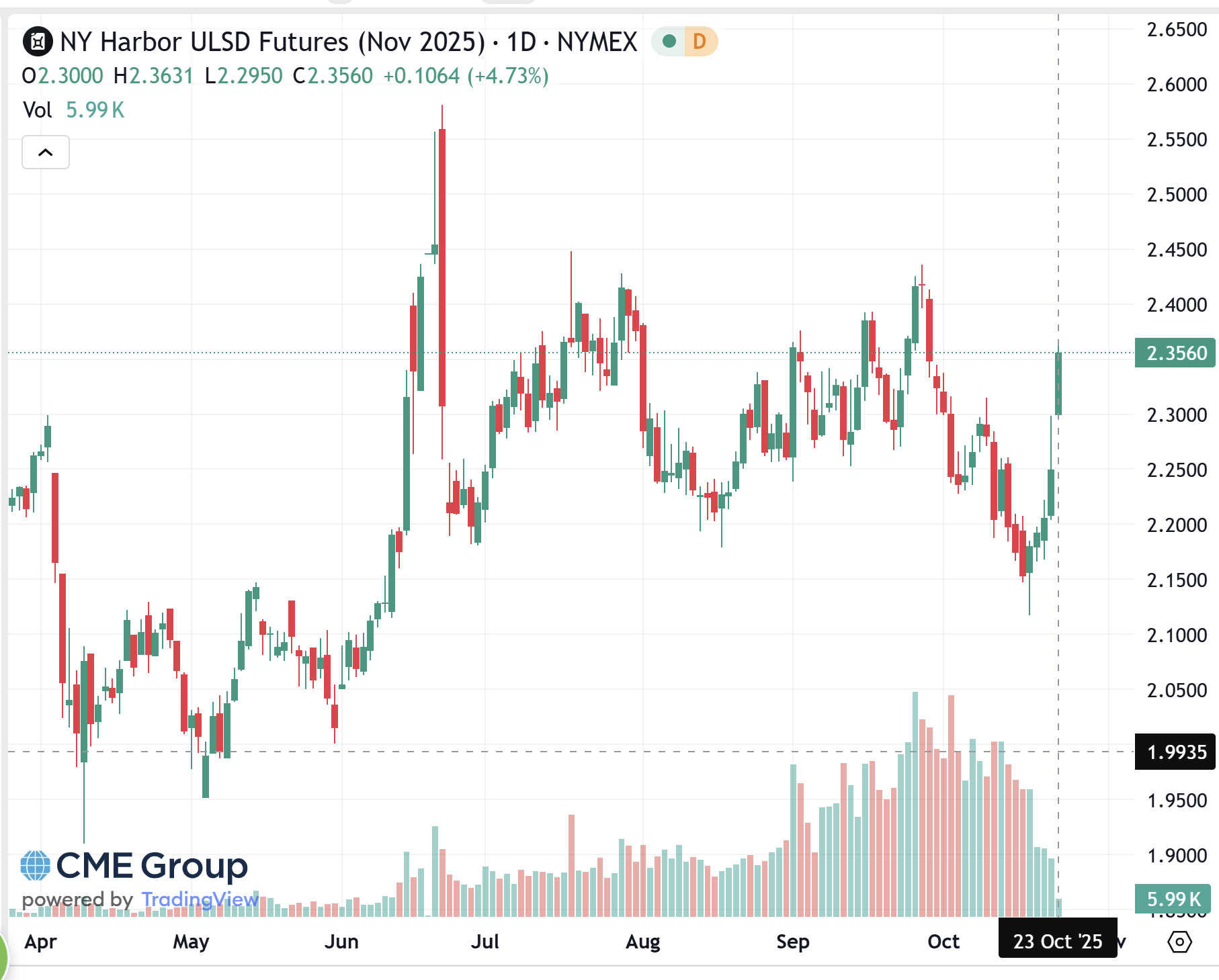 What a difference a week makes! Last week we were all feeling pretty good, wars were ending, pricing was falling, trade talks were on the horizon….. This week’s complete 180 degree turn has caused diesel futures to jump over $.15 yesterday and this morning, on top of roughly $.05 added earlier in the week. News broke that the scheduled Trump-Putin meeting was called off. A sticking point appears to be the demand that Ukrainian President Zelensky is removed either by elections or mandate in order for Russin troops to pull back. So, in our infinite wisdom, we immediately moved to the sanction/tariff tactic on those countries purchasing Russian crude. India is the collateral damage, and the President said India will “cut way, way, back on Russian Crude purchases” . That is 2 ‘ways’, so it sounds serious. Ultimately this would force other supply options to raise pricing for the uptick in demand. (recall the huge glut of floating product out there) This appears to be violent overreaction. Furthermore, we have put the pause on deescalating a Trade War with China as back and forth shipping restrictions were introduced. We officially meet with China at the end of the month. Hopefully we bring some Kit Kats (favorite) as Halloween treats and not Candy Corn. Still life goes on and we should be looking ahead winter operations. Keep in mind we carry a complete line of all your lubricant needs. From Methanol, power service, to drummed kerosene, we got you covered.